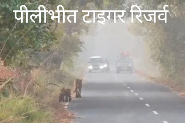 पीलीभीत “जंगल की सड़क पर बाघिन और उसके दो शावकों का परिवारिक टहलना—पीटीआर में सैलानियों के लिए अविस्मरणीय पल।”…