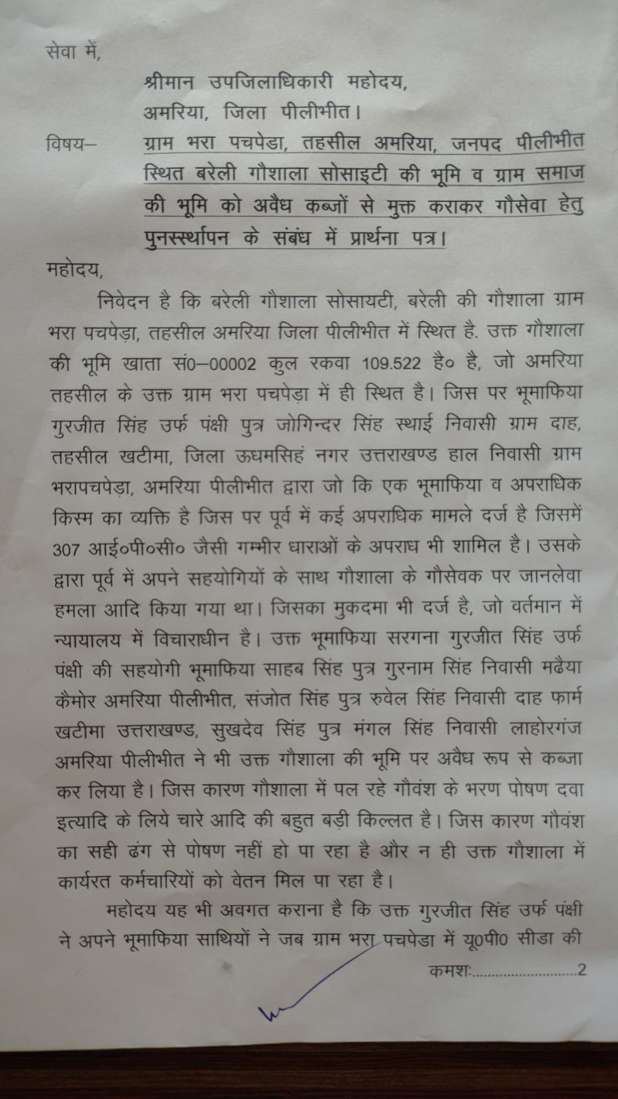 पीलीभीत। तहसील अमरिया क्षेत्र के ग्राम भरा पचपेड़ा स्थित बरेली गौशाला सोसायटी की भूमि को लेकर विवाद का मामला सामने आया है। गौशाला प्रबंधन ने उपजिलाधिकारी अमरिया को प्रार्थना पत्र देकर भूमि को कब्जा मुक्त कराने और मामले की निष्पक्ष जांच कराने की मांग की है।