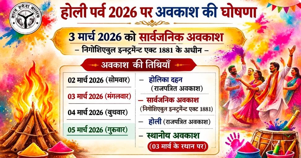 इसी क्रम में होली पर्व के पावन अवसर पर 03 मार्च 2026 (मंगलवार) को निगोशिएबुल इन्स्ट्रुमेंट एक्ट, 1881 के अधीन सार्वजनिक अवकाश घोषित किए जाने का निर्णय लिया गया है।