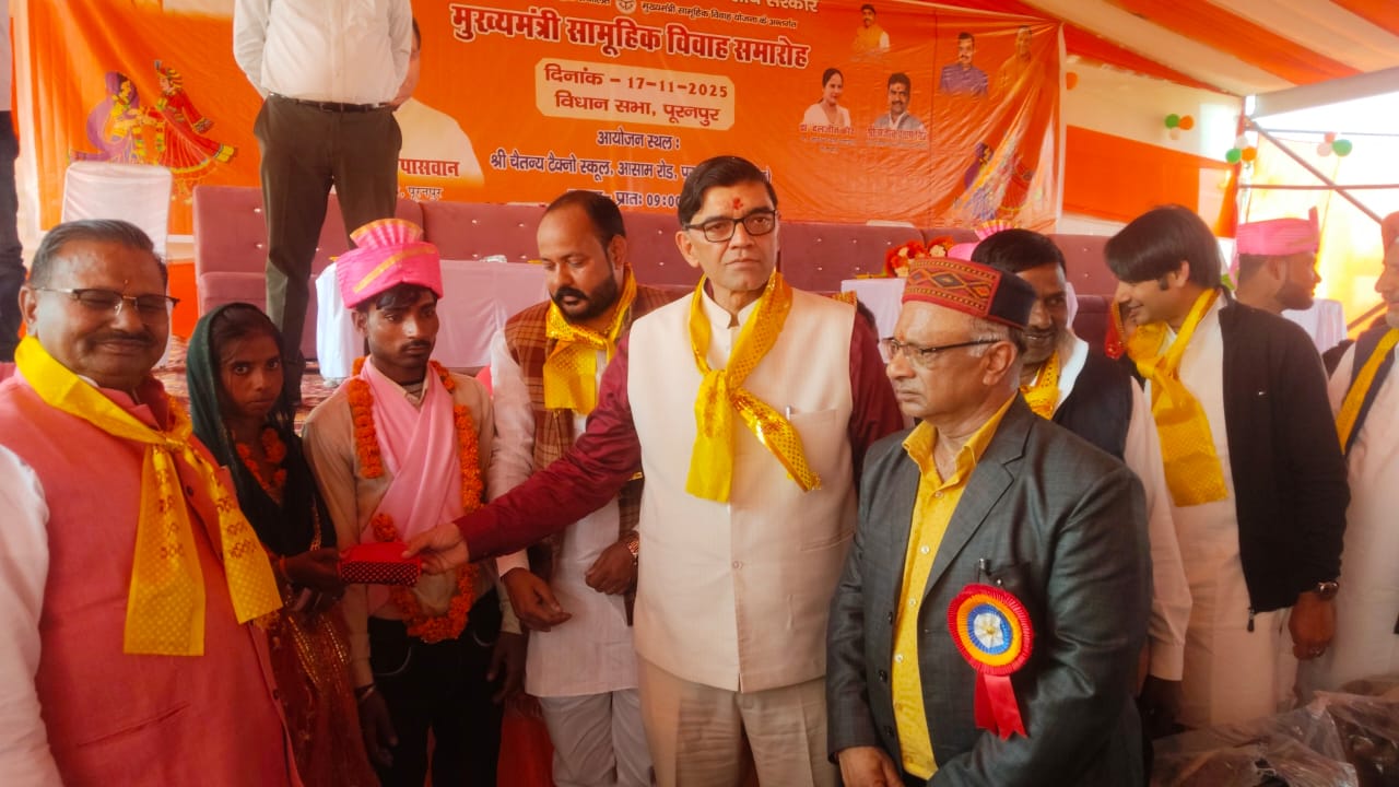 पीलीभीत : उत्तर प्रदेश के जनपद पीलीभीत के पूरनपुर तहसील मुख्यालय के निकट सोमवार को मुख्यमंत्री सामूहिक विवाह योजना के अंतर्गत भव्य विवाह समारोह का आयोजन संपन्न हुआ। इस महत्वपूर्ण सामाजिक कार्यक्रम में मुख्य अतिथि के रूप में विधायक पूरनपुर बाबूराम पासवान और जिलाधिकारी ज्ञानेंद्र सिंह मौजूद रहे। दोनों अतिथियों ने नवविवाहित जोड़ों को आशीर्वाद देते हुए उनके सुखद वैवाहिक जीवन की कामना की।