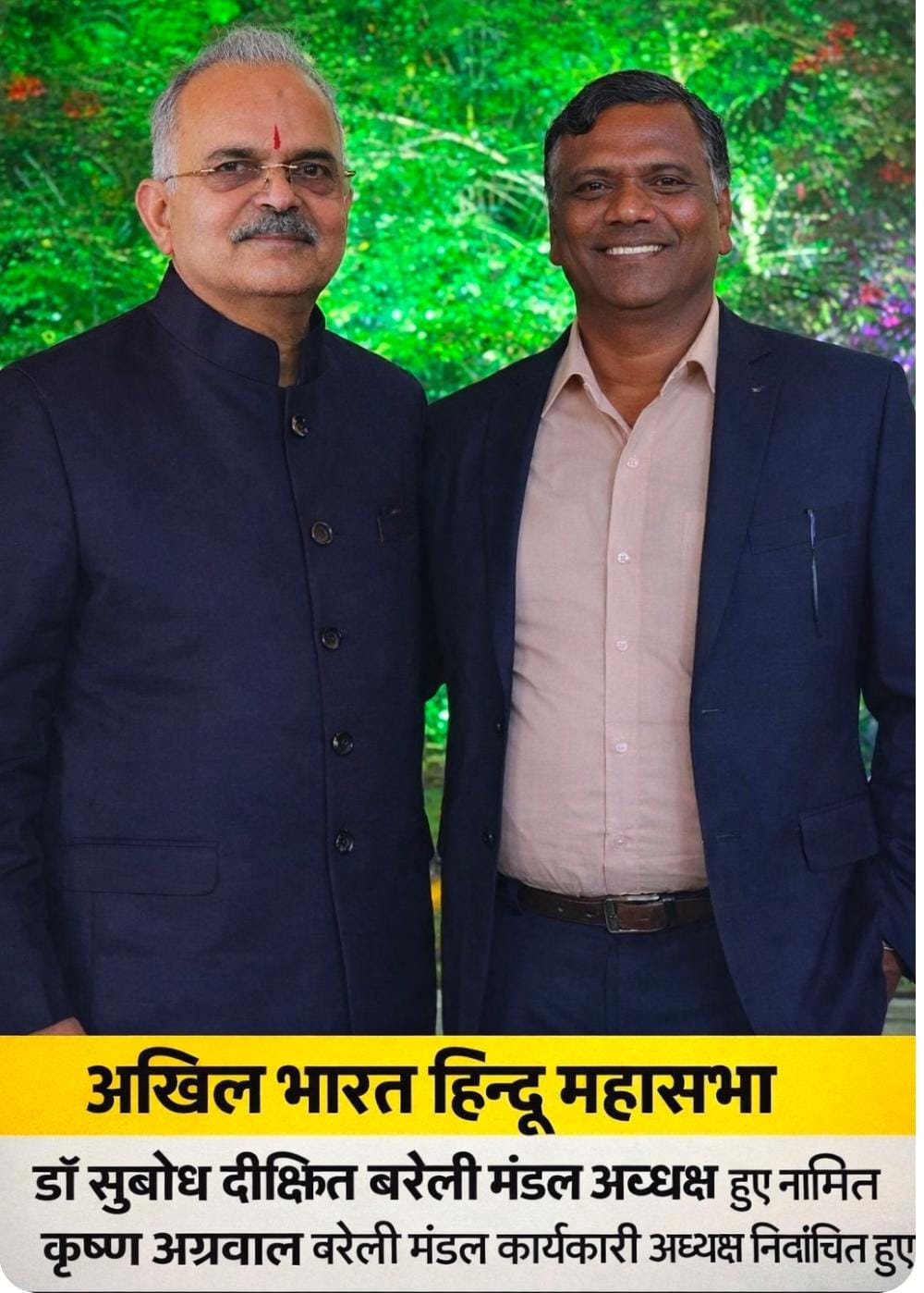 /बरेली। आशीष रायल पार्क के गणमान्य निवासी डा. सुबोध दीक्षित को अखिल भारत हिंदू महासभा द्वारा बरेली मंडल का अध्यक्ष नियुक्त किया गया है। वहीं कृष्ण कुमार अग्रवाल को संगठन का बरेली मंडल का कार्यकारी अध्यक्ष बनाया गया है।यह नियुक्ति संगठन के शीर्ष नेतृत्व की संस्तुति पर की गई है, जिसके बाद क्षेत्र के कार्यकर्ताओं और समर्थकों में उत्साह का माहौल है।
