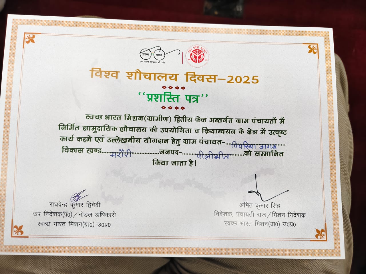 पीलीभीत : लखनऊ स्थित पंचायती राज निदेशालय में बुधवार को आयोजित राज्य स्तरीय कार्यक्रम में पीलीभीत की ग्राम पंचायत पिपरिया अगरु को कम्युनिटी सेनेट्री कॉम्प्लेक्स श्रेणी में पुरस्कृत किया गया। यह सम्मान पंचायती राज मंत्री ओमप्रकाश राजभर ने पीलीभीत से पहुँची छह सदस्यीय टीम को प्रदान किया गया।
