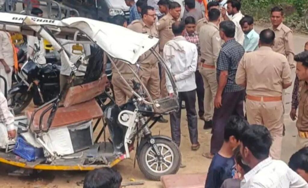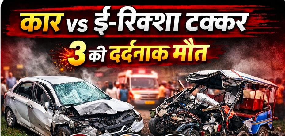 टक्कर इतनी जबरदस्त थी कि ई-रिक्शा पलट गया और उसके परखच्चे उड़ गए, जबकि कार अनियंत्रित होकर सड़क किनारे खड़ी ट्रॉली से जा टकराई।