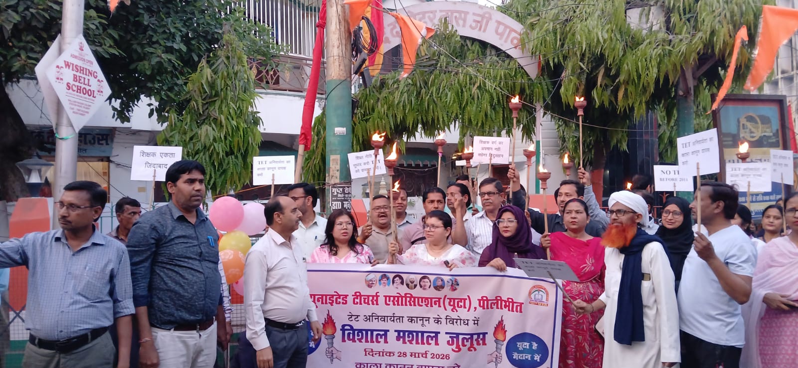 पूर्व निर्धारित कार्यक्रम के अनुसार 28 मार्च को यूटीये पीलीभीत के जिला अध्यक्ष राजेश मिश्रा के नेतृत्व में गांधी स्टेडियम से शहीद दामोदर दास पार्क (गैस चौराहा) तक मशाल जुलूस निकाला गया। जुलूस के माध्यम से शिक्षकों ने आरटीइ लागू होने से पहले नियुक्त शिक्षकों पर टेट लागू करने का विरोध जताया।