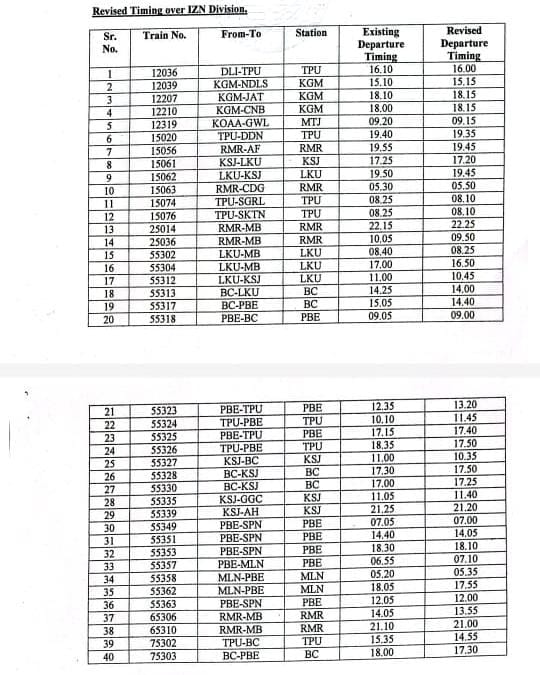 नई समय-सारिणी के अनुसार पीलीभीत से मैलानी जाने वाली सवारी गाड़ी, जो पहले सुबह 6:55 बजे प्रस्थान करती थी, अब 7:15 बजे जंक्शन से रवाना होगी। वहीं ट्रेन संख्या 12036 दिल्ली–टनकपुर का टनकपुर से प्रस्थान समय पहले 16:10 बजे था, जिसे बदलकर अब 16:00 बजे कर दिया गया है। इसी तरह ट्रेन संख्या 55323 पीलीभीत–टनकपुर, जो पहले 12:35 बजे पीलीभीत जंक्शन से चलती थी, अब 13:20 बजे प्रस्थान करेगी। रेल विभाग ने यात्रियों से अपील की है कि यात्रा से पूर्व नई समय-सारिणी की जानकारी अवश्य प्राप्त कर लें।