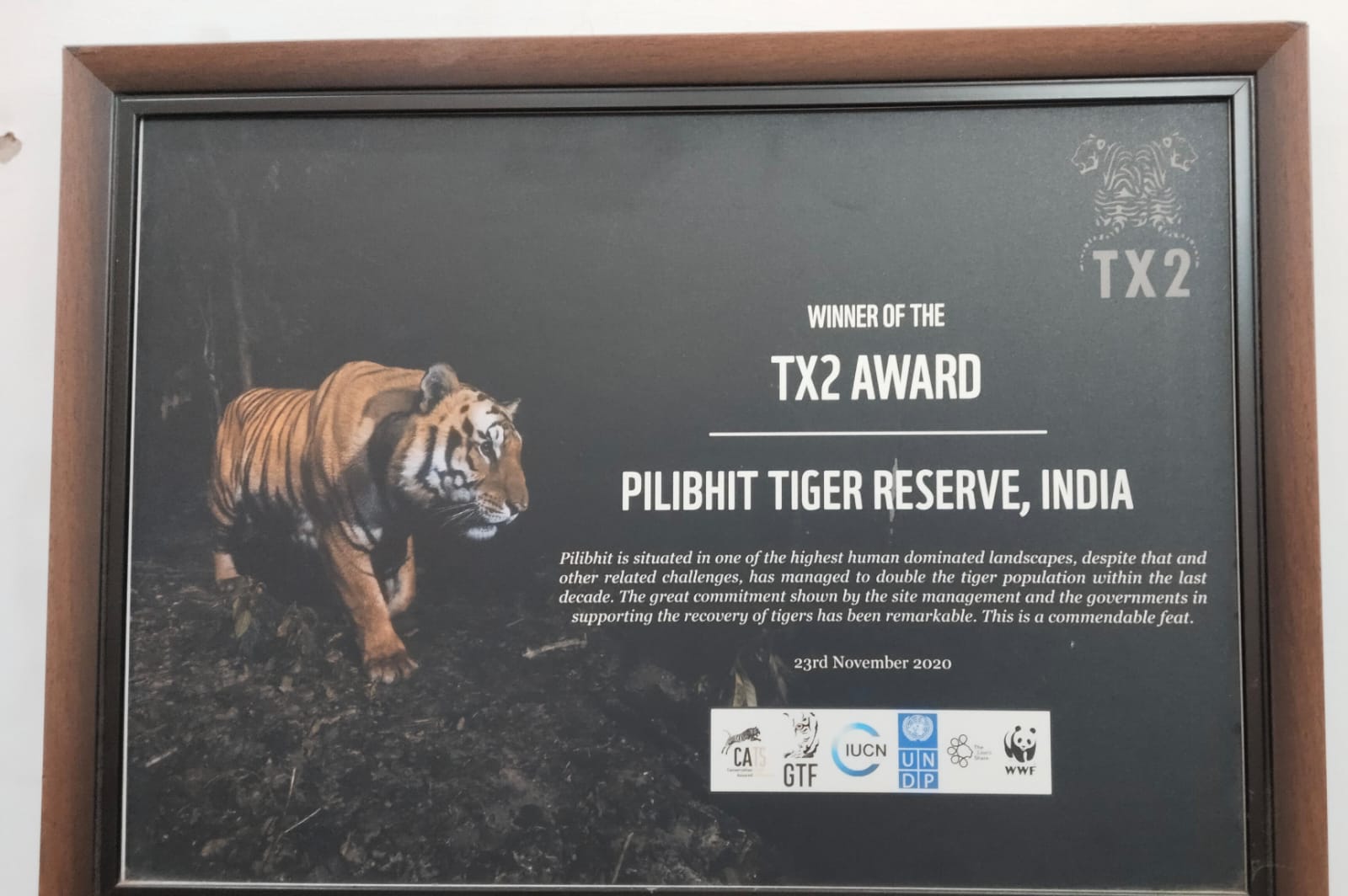 इस समारोह में विभाग के प्रमुख वन संरक्षक (वन्यजीव) सुनील पांडेय को प्रशस्ति पत्र प्रदान किया गया, जिसने पूरे राज्य का गौरव बढ़ाया।इन अंतरराष्ट्रीय संस्थाओं द्वारा नेपाल, भूटान, रूस, इंडोनेशिया, थाईलैंड, बांग्लादेश, पाकिस्तान सहित कुल 13 देशों में टाइगर मॉनीटरिंग की गई। इस विस्तृत अध्ययन के बाद पाया गया कि सबसे तेजी से बाघों की संख्या में वृद्धि पीलीभीत टाइगर रिज़र्व में हुई।