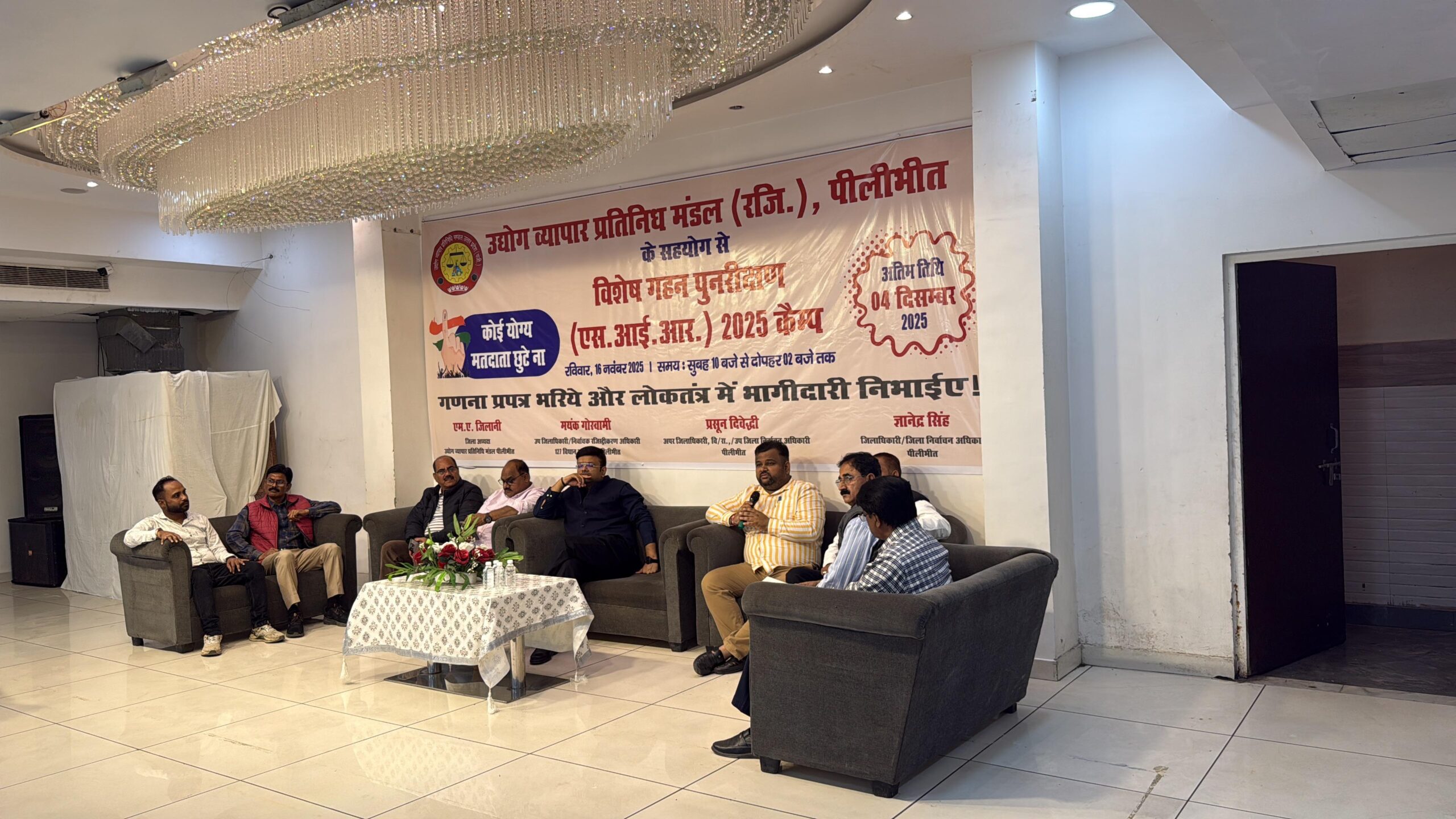 पीलीभीत : शनिवार, 16 नवंबर को पीलीभीत के सिटी पैलेस में आयोजित विशेष गहन पुनरीक्षण (SIR) कैंप ने व्यापारियों और आम नागरिकों को बड़ी राहत प्रदान की। उद्योग व्यापार प्रतिनिधिमंडल के ज़िला अध्यक्ष एम. ए. जिलानी के अनुरोध पर, डीएम ज्ञानेंद्र सिंह के निर्देशन में आयोजित इस शिविर का उद्देश्य एस आई आर से संबंधित तकनीकी व प्रक्रियागत समस्याओं का मौके पर समाधान करना था। शिविर ने प्रशासन और नागरिकों को एक साझा मंच प्रदान किया, जहाँ संवाद के माध्यम से कई मुद्दों का तुरंत निदान संभव हुआ।